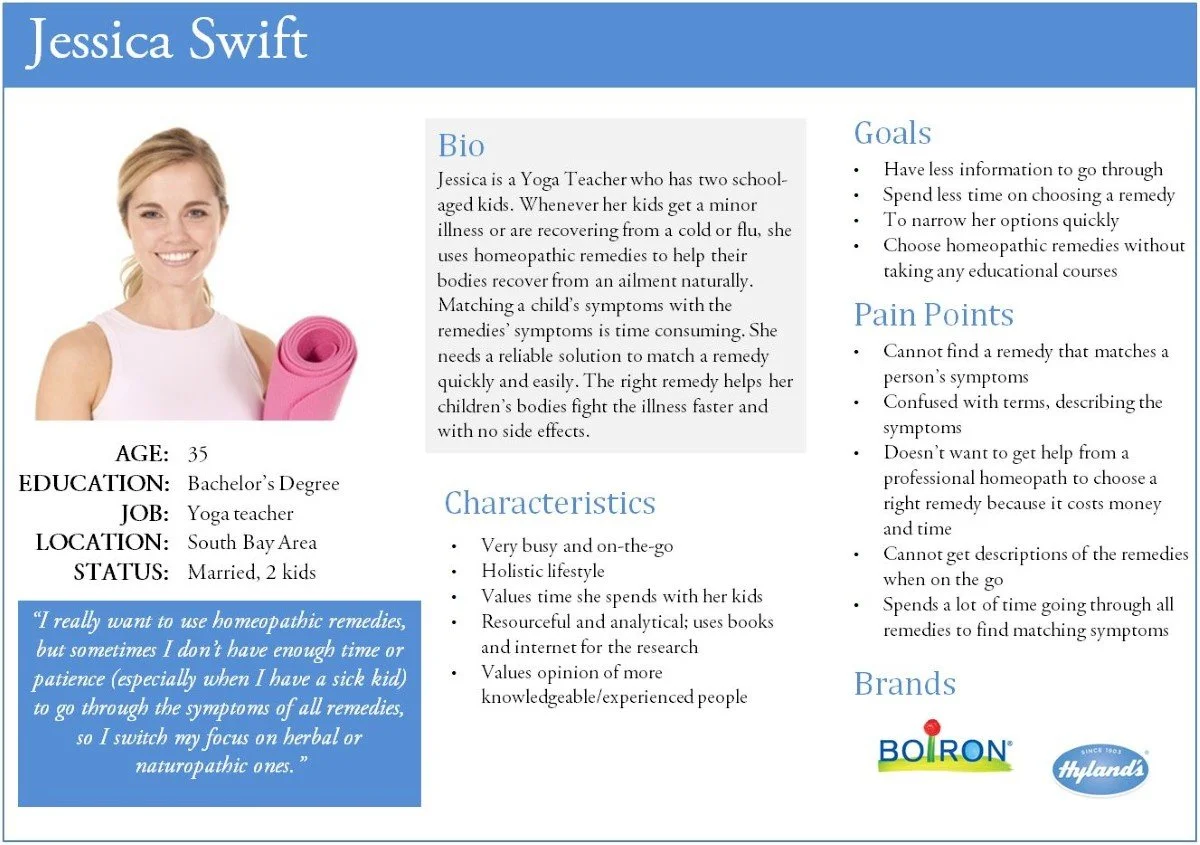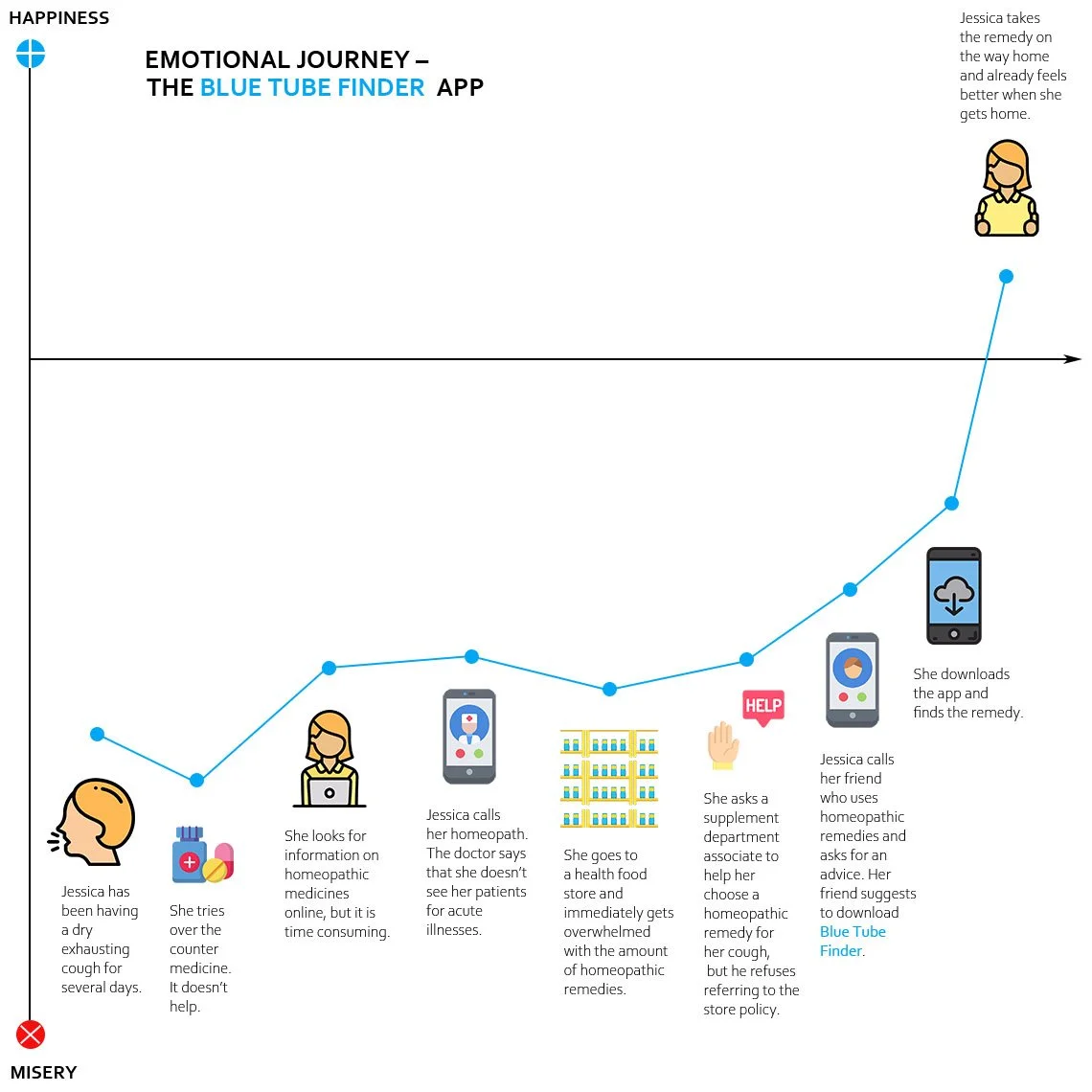 To understand the user's pain points and see touchpoints between the user and solution, I created Jessica's experience on the Emotional Journey Map below, when she is having a cough and trying to find a homeopathic remedy.
