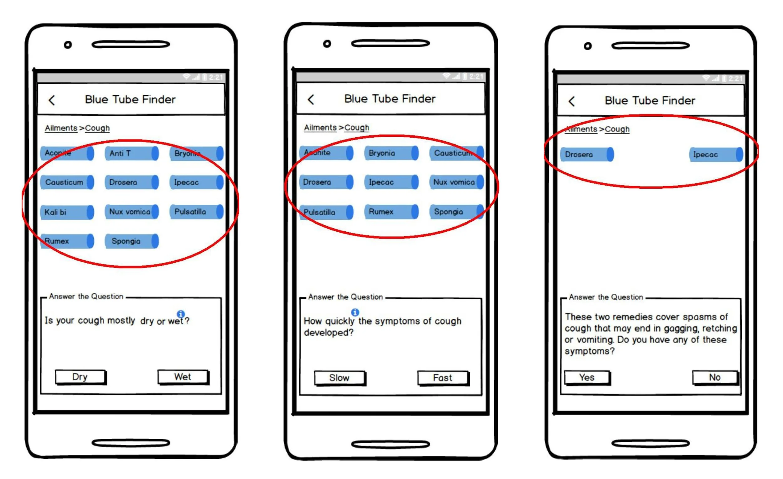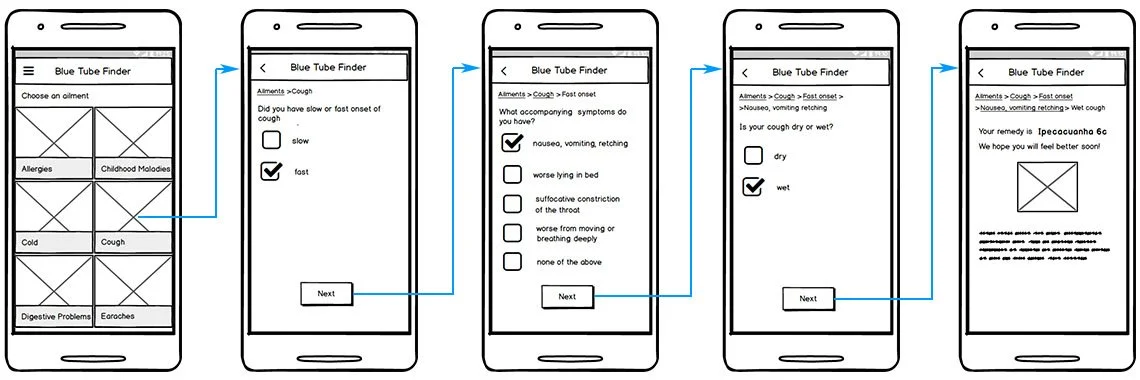 UX research showed that there was a need for a digital product that could help a homeopathic practitioner and her patients find the right homeopathic remedy quickly, on a go, and without a homeopathic practitioner's help. The solution was to design a mobile application Blue Tube Finder. The app would provide the user with a list of homeopathic remedies for a particular illness, provide descriptions of each remedy, and help to match the patient’s symptoms with the ones that a remedy relieves.